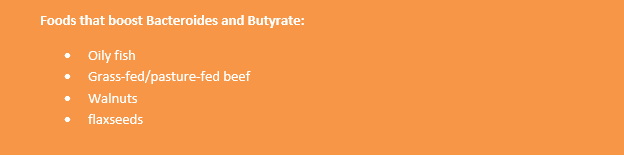 For example, our friends bacteroides, as well as helping weight regulation, help break down fibre from vegetables, producing a chemical called butyrate, which is great to protect us from bowel cancer and is very anti-inflammatory. Butyrate also keeps your gut lining strong, stopping toxins getting into your body. Foods producing butyrate include oily fish, grass-fed beef (NOT standard beef), walnuts, flaxseeds.